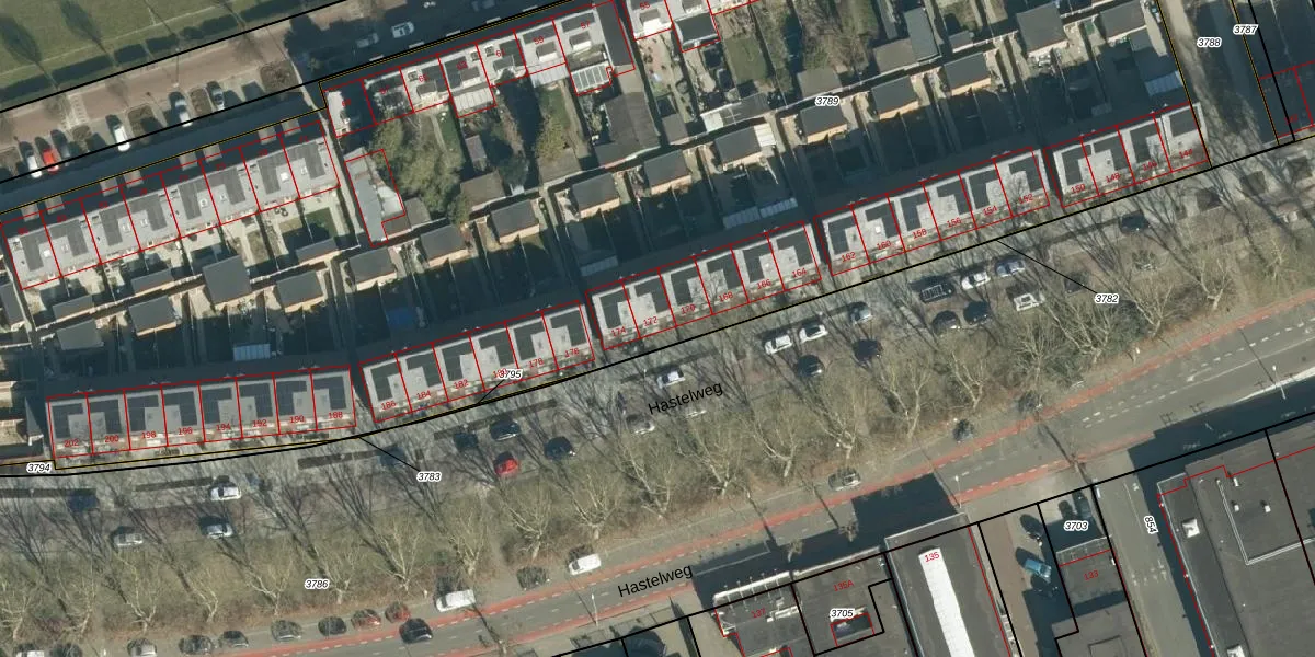 Hastelweg 172 is gelegen op kadastraal perceel STR03D3789. Deze kadastrale aanduiding is uniek en wordt gebruikt door het Kadaster om eigendomsrechten en andere zakelijke rechten vast te leggen. Het perceel maakt onderdeel uit van de kadastrale gemeente Strijp.