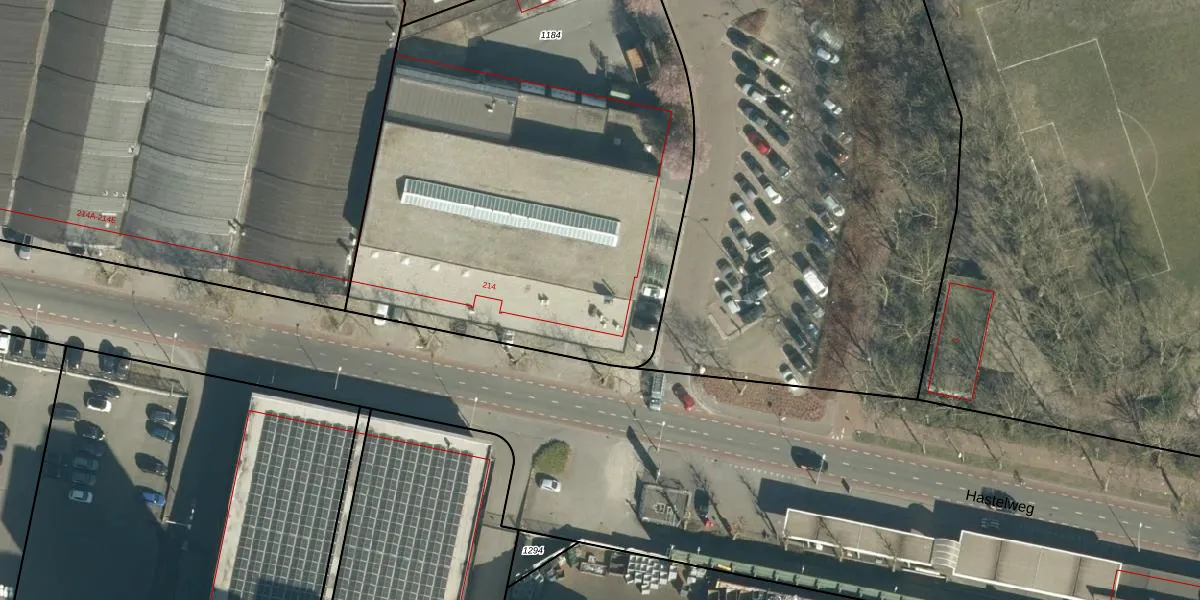 Hastelweg 214 is gelegen op kadastraal perceel STR03D1184. Deze kadastrale aanduiding is uniek en wordt gebruikt door het Kadaster om eigendomsrechten en andere zakelijke rechten vast te leggen. Het perceel maakt onderdeel uit van de kadastrale gemeente Strijp.