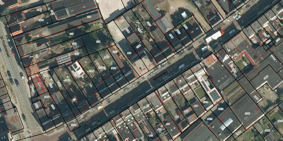 Hastelweg 38 is gelegen op kadastraal perceel STR03D369. Deze kadastrale aanduiding is uniek en wordt gebruikt door het Kadaster om eigendomsrechten en andere zakelijke rechten vast te leggen. Het perceel maakt onderdeel uit van de kadastrale gemeente Strijp.