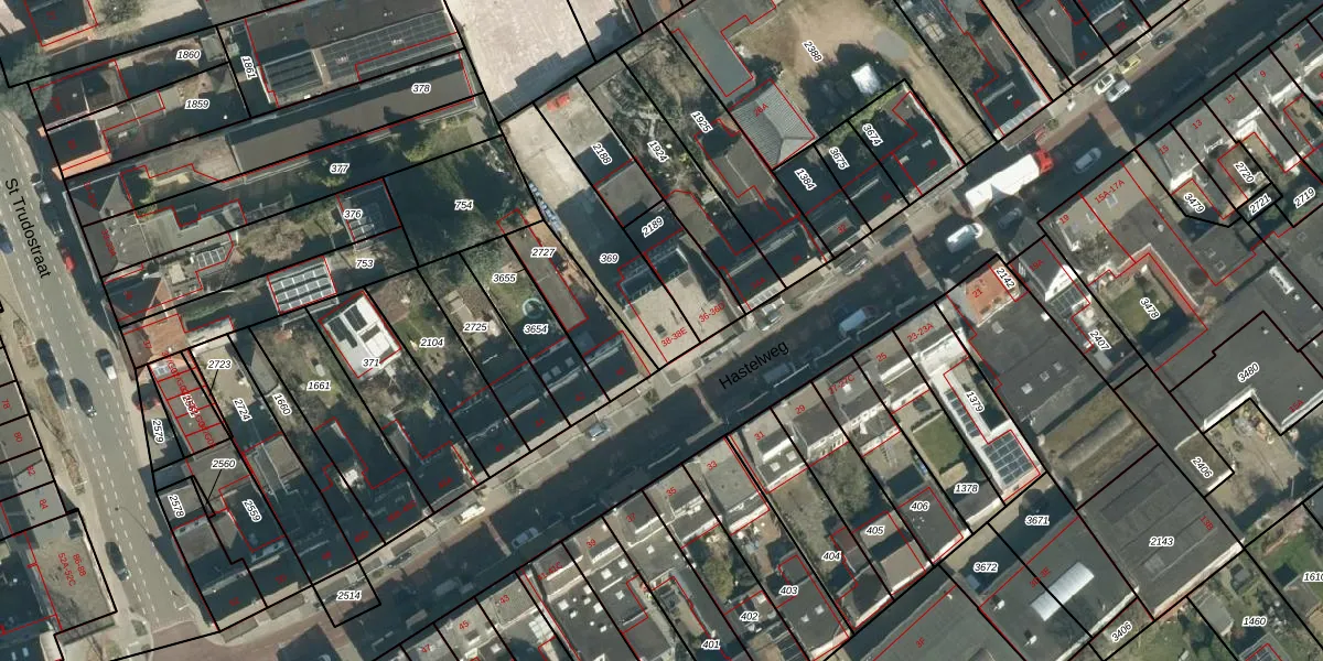 Hastelweg 38-A is gelegen op kadastraal perceel STR03D369. Deze kadastrale aanduiding is uniek en wordt gebruikt door het Kadaster om eigendomsrechten en andere zakelijke rechten vast te leggen. Het perceel maakt onderdeel uit van de kadastrale gemeente Strijp.