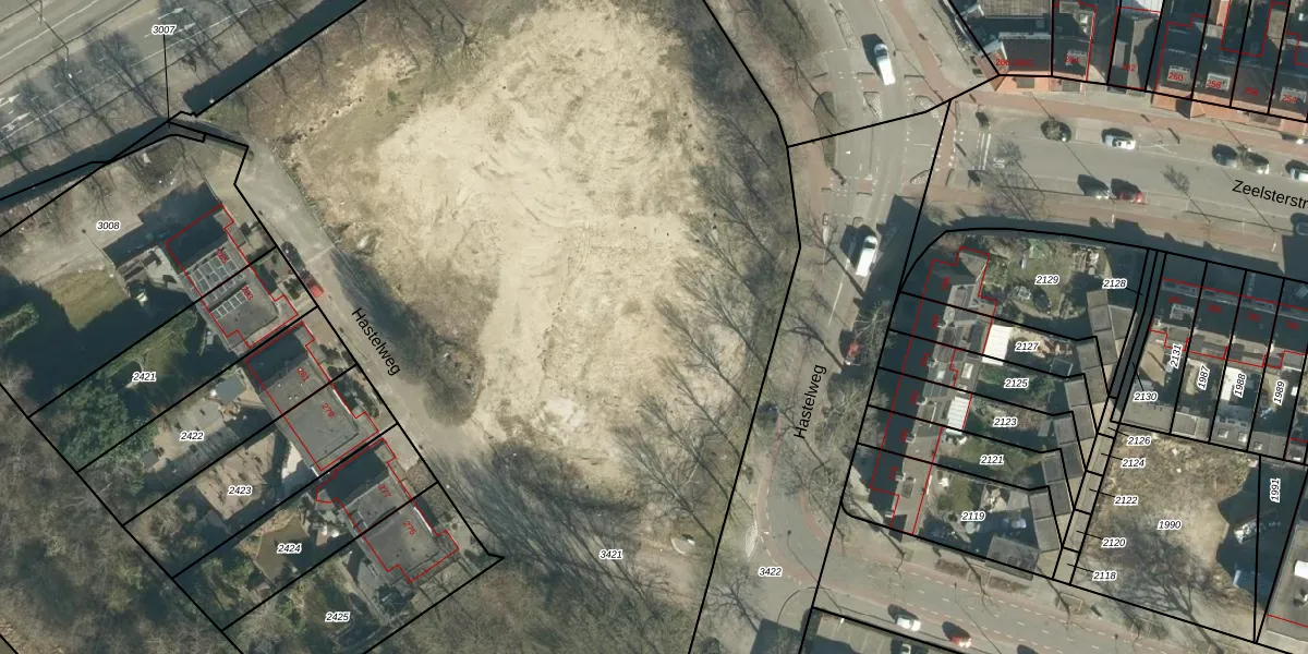 Hastelweg 381 is gelegen op kadastraal perceel STR03D3421. Deze kadastrale aanduiding is uniek en wordt gebruikt door het Kadaster om eigendomsrechten en andere zakelijke rechten vast te leggen. Het perceel maakt onderdeel uit van de kadastrale gemeente Strijp.