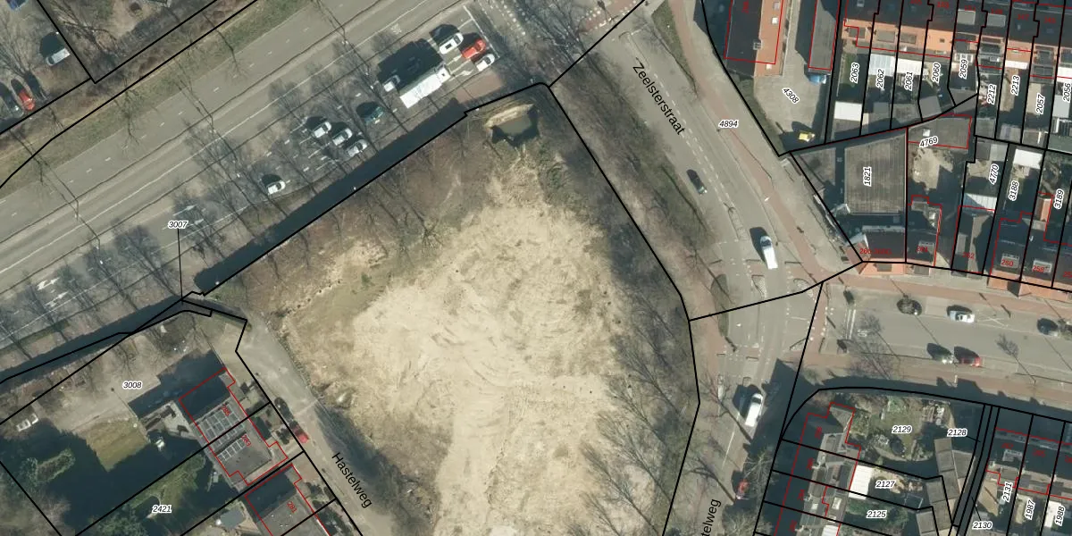 Het perceel waarop Hastelweg 421 staat heeft een oppervlakte van 8516 m². Dit is een zeer groot perceel. De perceeloppervlakte wordt geregistreerd door het Kadaster. Gedetailleerde informatie over de maten van dit perceel kunt u vinden in het rapport Kadastrale kaart met maatvoering van Hastelweg 421.