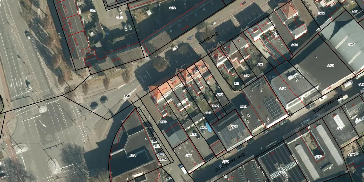 Hastelweg 93 is gelegen op kadastraal perceel STR03D1964. Deze kadastrale aanduiding is uniek en wordt gebruikt door het Kadaster om eigendomsrechten en andere zakelijke rechten vast te leggen. Het perceel maakt onderdeel uit van de kadastrale gemeente Strijp.