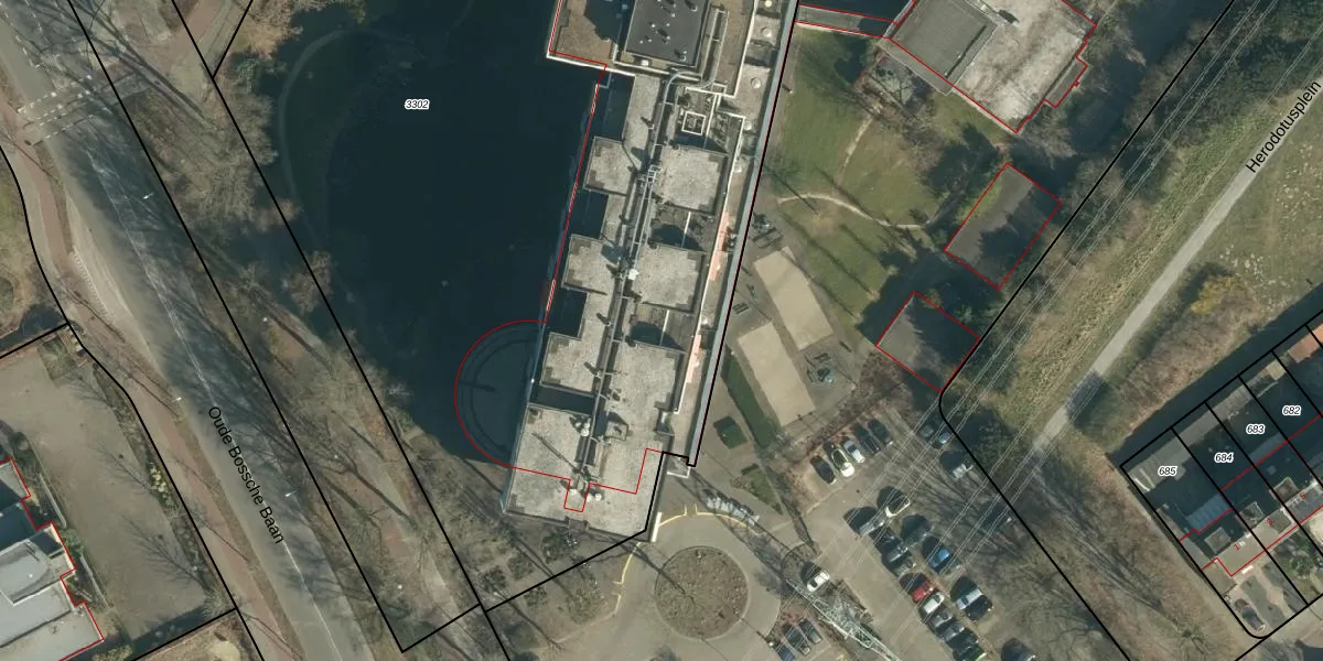 Het perceel waarop Herodotusplein 243 staat heeft een oppervlakte van 8875 m². Dit is een zeer groot perceel. De perceeloppervlakte wordt geregistreerd door het Kadaster. Gedetailleerde informatie over de maten van dit perceel kunt u vinden in het rapport Kadastrale kaart met maatvoering van Herodotusplein 243.