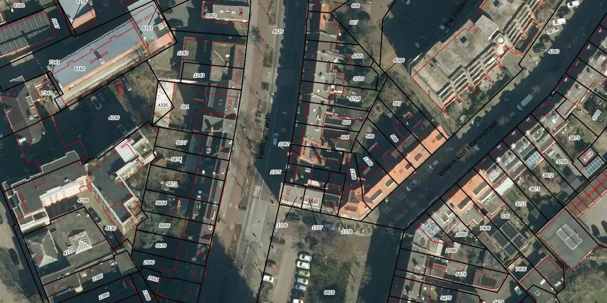 Het perceel waarop Hertogstraat 23 staat heeft een oppervlakte van 119 m². Dit is een middelgroot perceel. De perceeloppervlakte wordt geregistreerd door het Kadaster. Gedetailleerde informatie over de maten van dit perceel kunt u vinden in het rapport Kadastrale kaart met maatvoering van Hertogstraat 23.
