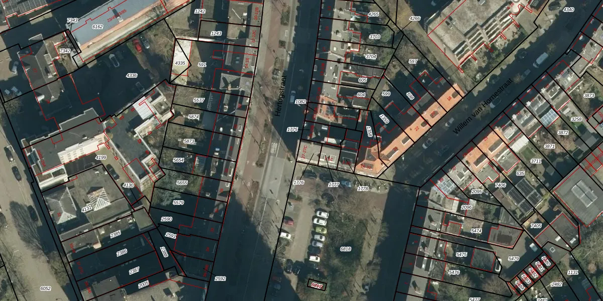 Het perceel waarop Hertogstraat 27 staat heeft een oppervlakte van 59 m². Dit is een klein perceel. De perceeloppervlakte wordt geregistreerd door het Kadaster. Gedetailleerde informatie over de maten van dit perceel kunt u vinden in het rapport Kadastrale kaart met maatvoering van Hertogstraat 27.