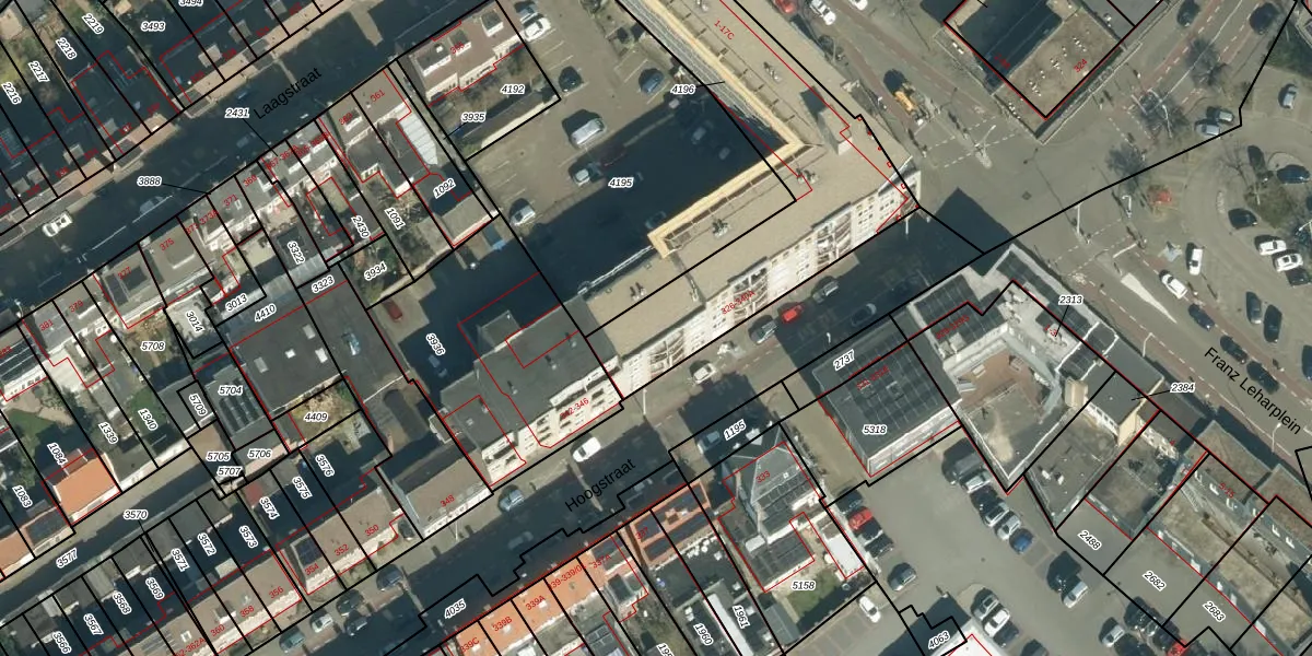Het perceel waarop Hoogstraat 340 staat heeft een oppervlakte van 1281 m². Dit is een zeer groot perceel. De perceeloppervlakte wordt geregistreerd door het Kadaster. Gedetailleerde informatie over de maten van dit perceel kunt u vinden in het rapport Kadastrale kaart met maatvoering van Hoogstraat 340.
