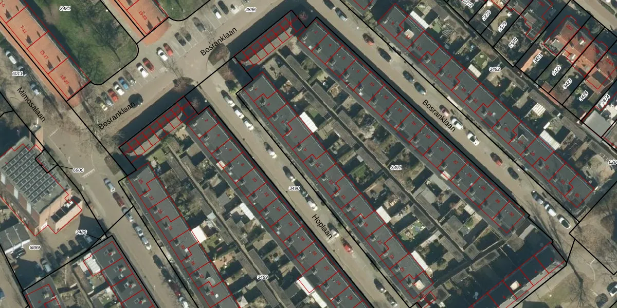 Het perceel waarop Hoplaan 9 staat heeft een oppervlakte van 5045 m². Dit is een zeer groot perceel. De perceeloppervlakte wordt geregistreerd door het Kadaster. Gedetailleerde informatie over de maten van dit perceel kunt u vinden in het rapport Kadastrale kaart met maatvoering van Hoplaan 9.