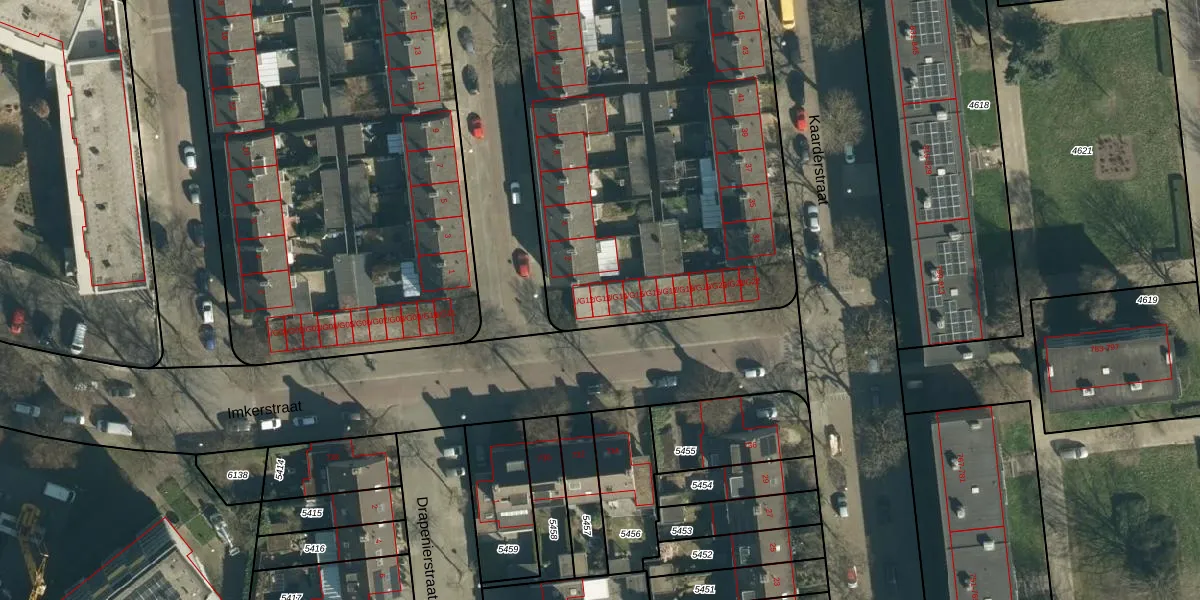 Het perceel waarop Imkerstraat 1-G13 staat heeft een oppervlakte van 5463 m². Dit is een zeer groot perceel. De perceeloppervlakte wordt geregistreerd door het Kadaster. Gedetailleerde informatie over de maten van dit perceel kunt u vinden in het rapport Kadastrale kaart met maatvoering van Imkerstraat 1-G13.