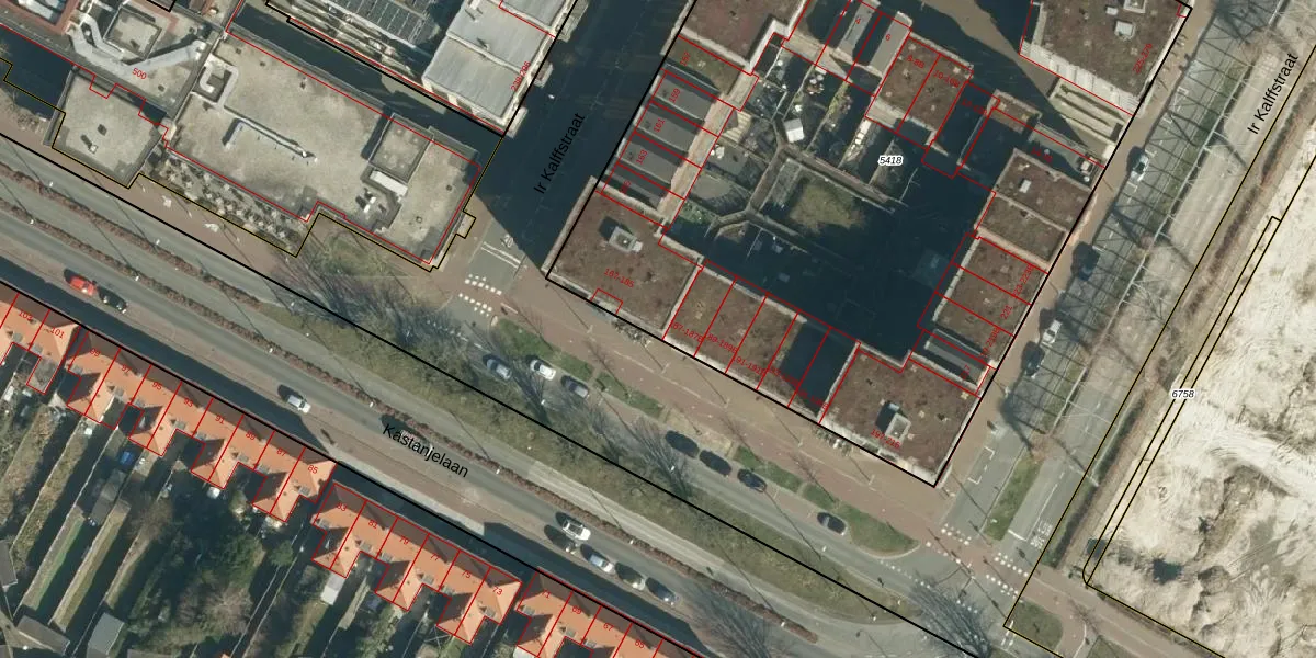Ir Kalffstraat 185 is gelegen op kadastraal perceel STR03C5418. Deze kadastrale aanduiding is uniek en wordt gebruikt door het Kadaster om eigendomsrechten en andere zakelijke rechten vast te leggen. Het perceel maakt onderdeel uit van de kadastrale gemeente Strijp.