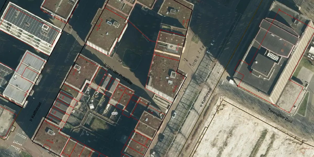 Ir Kalffstraat 253 is gelegen op kadastraal perceel STR03C5418. Deze kadastrale aanduiding is uniek en wordt gebruikt door het Kadaster om eigendomsrechten en andere zakelijke rechten vast te leggen. Het perceel maakt onderdeel uit van de kadastrale gemeente Strijp.