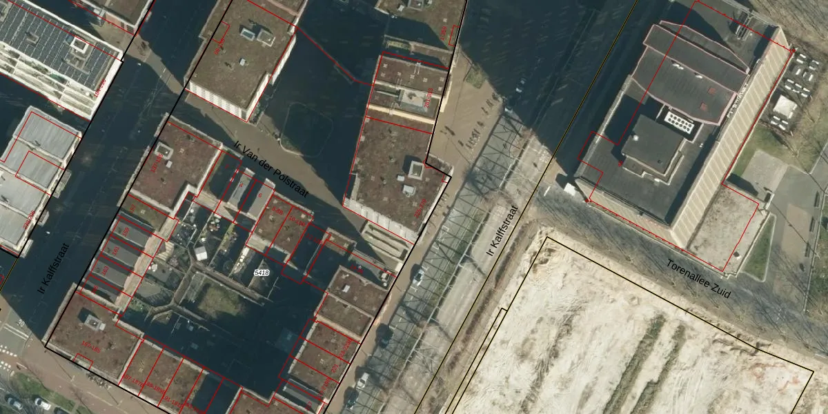 Ir Kalffstraat 265 is gelegen op kadastraal perceel STR03C5418. Deze kadastrale aanduiding is uniek en wordt gebruikt door het Kadaster om eigendomsrechten en andere zakelijke rechten vast te leggen. Het perceel maakt onderdeel uit van de kadastrale gemeente Strijp.