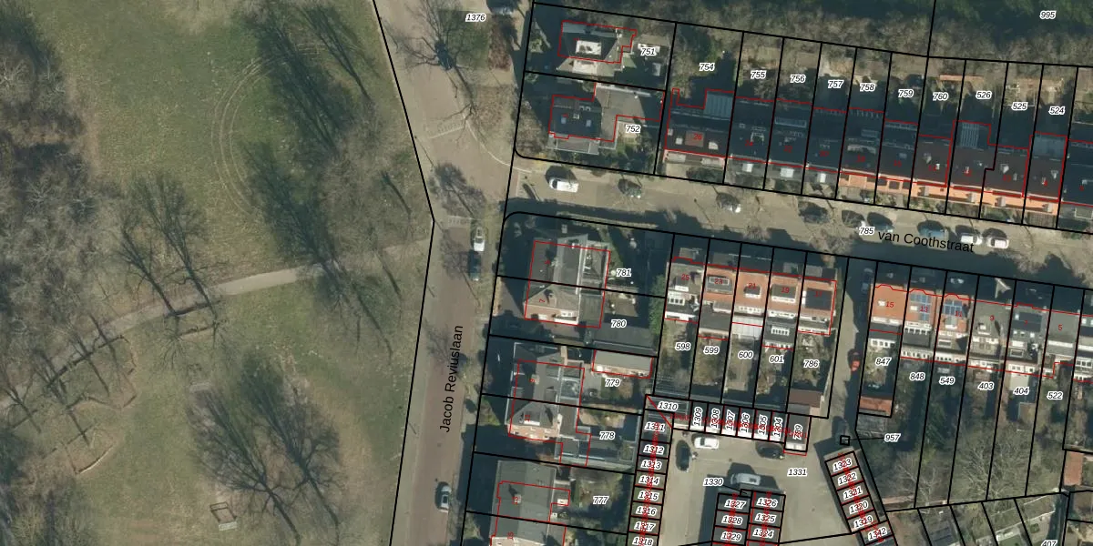 Het perceel waarop Jacob Reviuslaan 5 staat heeft een oppervlakte van 373 m². Dit is een groot perceel. De perceeloppervlakte wordt geregistreerd door het Kadaster. Gedetailleerde informatie over de maten van dit perceel kunt u vinden in het rapport Kadastrale kaart met maatvoering van Jacob Reviuslaan 5.