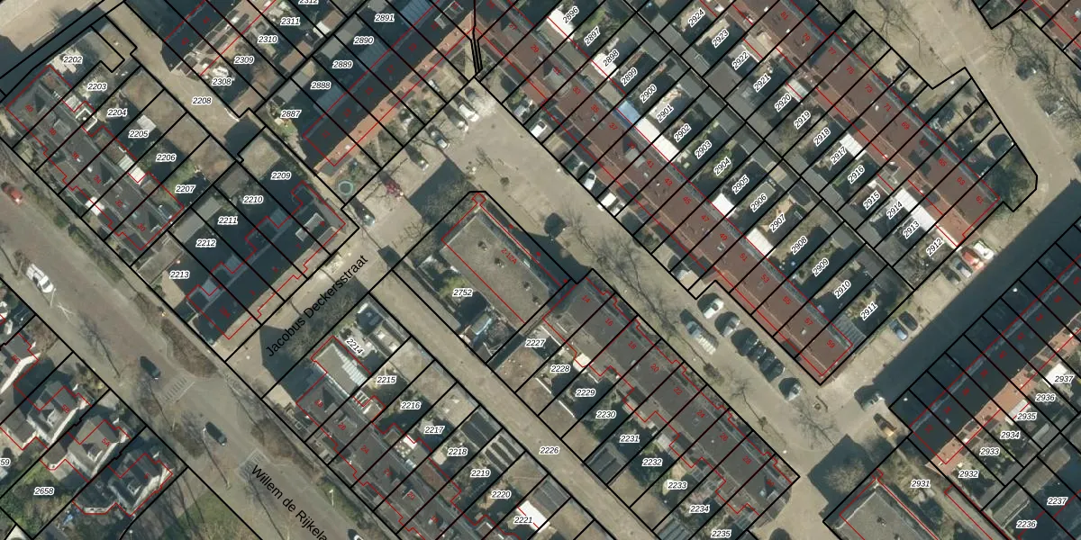 Het perceel waarop Jacobus Deckersstraat 6 staat heeft een oppervlakte van 551 m². Dit is een groot perceel. De perceeloppervlakte wordt geregistreerd door het Kadaster. Gedetailleerde informatie over de maten van dit perceel kunt u vinden in het rapport Kadastrale kaart met maatvoering van Jacobus Deckersstraat 6.