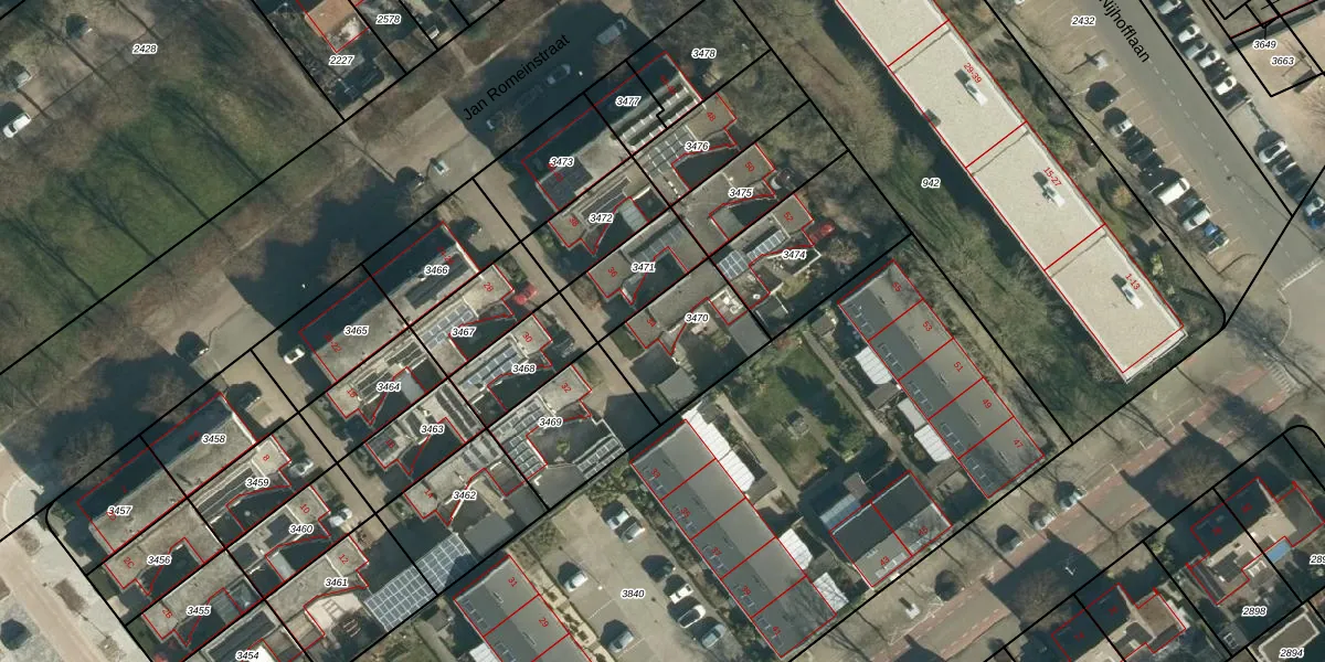 Het perceel waarop Jan Romeinstraat 34 staat heeft een oppervlakte van 332 m². Dit is een groot perceel. De perceeloppervlakte wordt geregistreerd door het Kadaster. Gedetailleerde informatie over de maten van dit perceel kunt u vinden in het rapport Kadastrale kaart met maatvoering van Jan Romeinstraat 34.