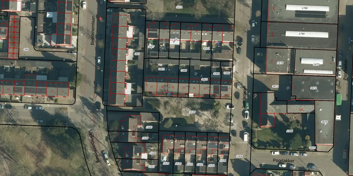 Het perceel waarop Jericholaan 21 staat heeft een oppervlakte van 550 m². Dit is een groot perceel. De perceeloppervlakte wordt geregistreerd door het Kadaster. Gedetailleerde informatie over de maten van dit perceel kunt u vinden in het rapport Kadastrale kaart met maatvoering van Jericholaan 21.