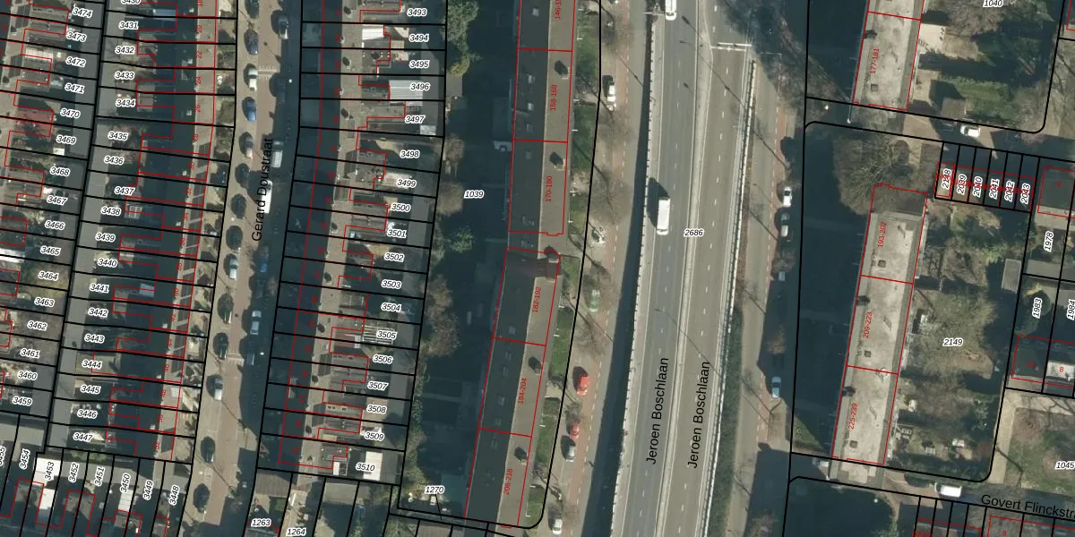 Het perceel waarop Jeroen Boschlaan 186 staat heeft een oppervlakte van 2974 m². Dit is een zeer groot perceel. De perceeloppervlakte wordt geregistreerd door het Kadaster. Gedetailleerde informatie over de maten van dit perceel kunt u vinden in het rapport Kadastrale kaart met maatvoering van Jeroen Boschlaan 186.