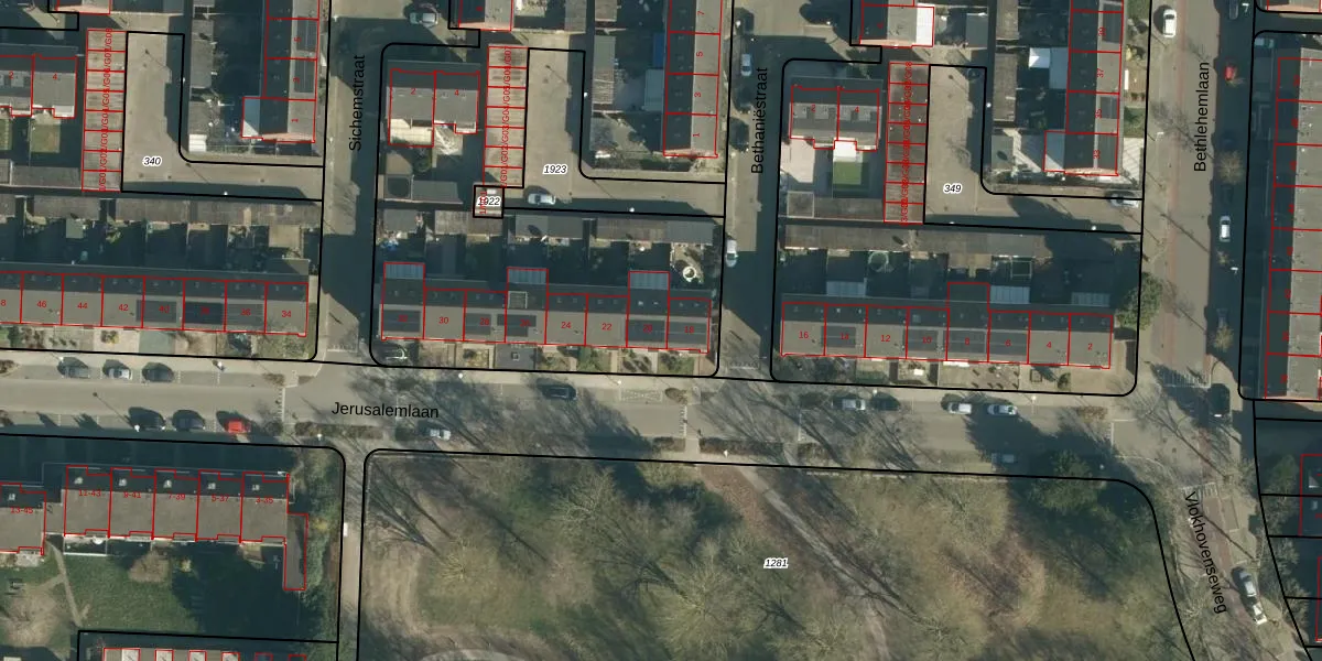 Het perceel waarop Jerusalemlaan 20 staat heeft een oppervlakte van 3860 m². Dit is een zeer groot perceel. De perceeloppervlakte wordt geregistreerd door het Kadaster. Gedetailleerde informatie over de maten van dit perceel kunt u vinden in het rapport Kadastrale kaart met maatvoering van Jerusalemlaan 20.