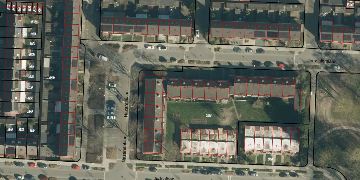 Jerusalemlaan 21 is gelegen op kadastraal perceel WSL01M756. Deze kadastrale aanduiding is uniek en wordt gebruikt door het Kadaster om eigendomsrechten en andere zakelijke rechten vast te leggen. Het perceel maakt onderdeel uit van de kadastrale gemeente Woensel.