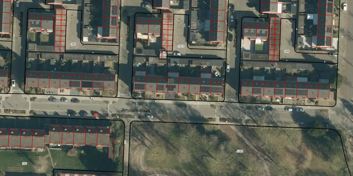 Het perceel waarop Jerusalemlaan 26 staat heeft een oppervlakte van 3860 m². Dit is een zeer groot perceel. De perceeloppervlakte wordt geregistreerd door het Kadaster. Gedetailleerde informatie over de maten van dit perceel kunt u vinden in het rapport Kadastrale kaart met maatvoering van Jerusalemlaan 26.
