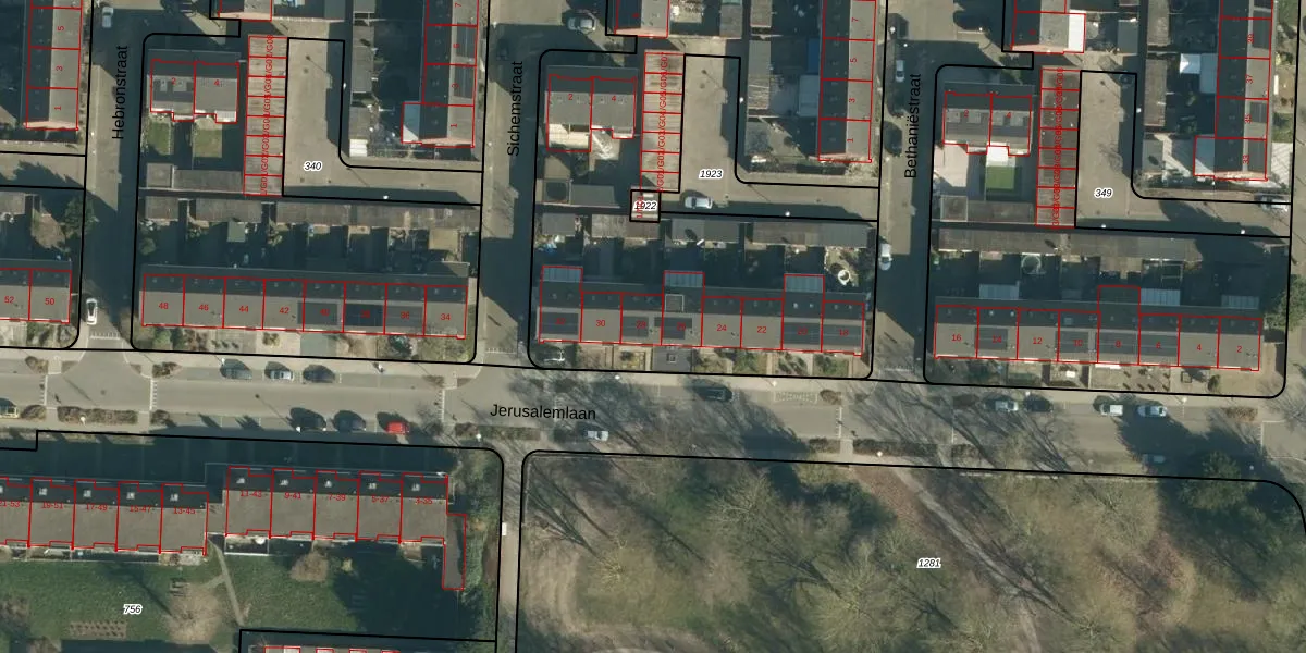 Het perceel waarop Jerusalemlaan 28 staat heeft een oppervlakte van 3860 m². Dit is een zeer groot perceel. De perceeloppervlakte wordt geregistreerd door het Kadaster. Gedetailleerde informatie over de maten van dit perceel kunt u vinden in het rapport Kadastrale kaart met maatvoering van Jerusalemlaan 28.