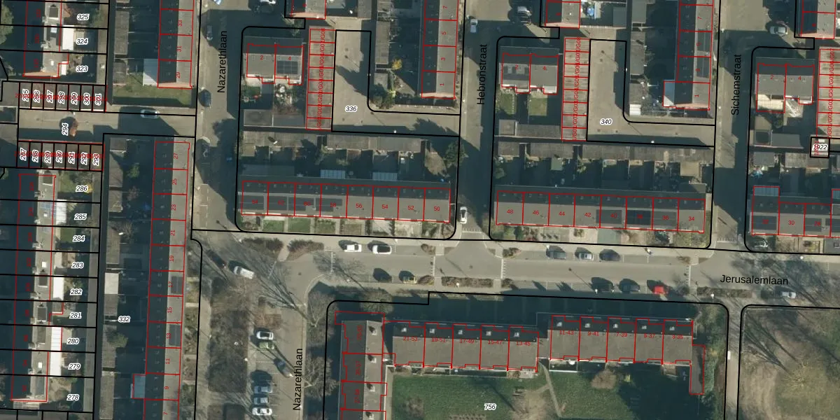 Jerusalemlaan 52 is gelegen op kadastraal perceel WSL01M335. Deze kadastrale aanduiding is uniek en wordt gebruikt door het Kadaster om eigendomsrechten en andere zakelijke rechten vast te leggen. Het perceel maakt onderdeel uit van de kadastrale gemeente Woensel.