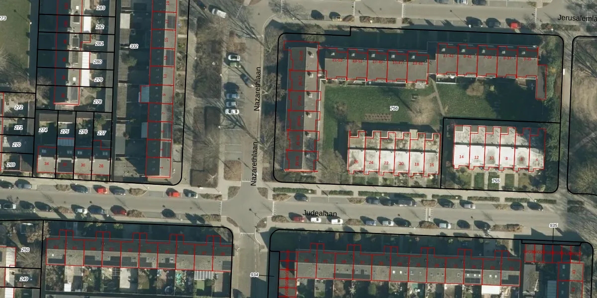 Het perceel waarop Jerusalemlaan 63 staat heeft een oppervlakte van 4052 m². Dit is een zeer groot perceel. De perceeloppervlakte wordt geregistreerd door het Kadaster. Gedetailleerde informatie over de maten van dit perceel kunt u vinden in het rapport Kadastrale kaart met maatvoering van Jerusalemlaan 63.