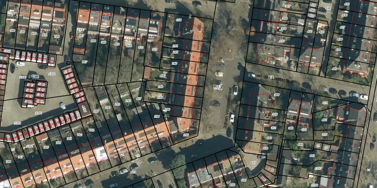Het perceel waarop Johan Vestersstraat 50 staat heeft een oppervlakte van 182 m². Dit is een middelgroot perceel. De perceeloppervlakte wordt geregistreerd door het Kadaster. Gedetailleerde informatie over de maten van dit perceel kunt u vinden in het rapport Kadastrale kaart met maatvoering van Johan Vestersstraat 50.