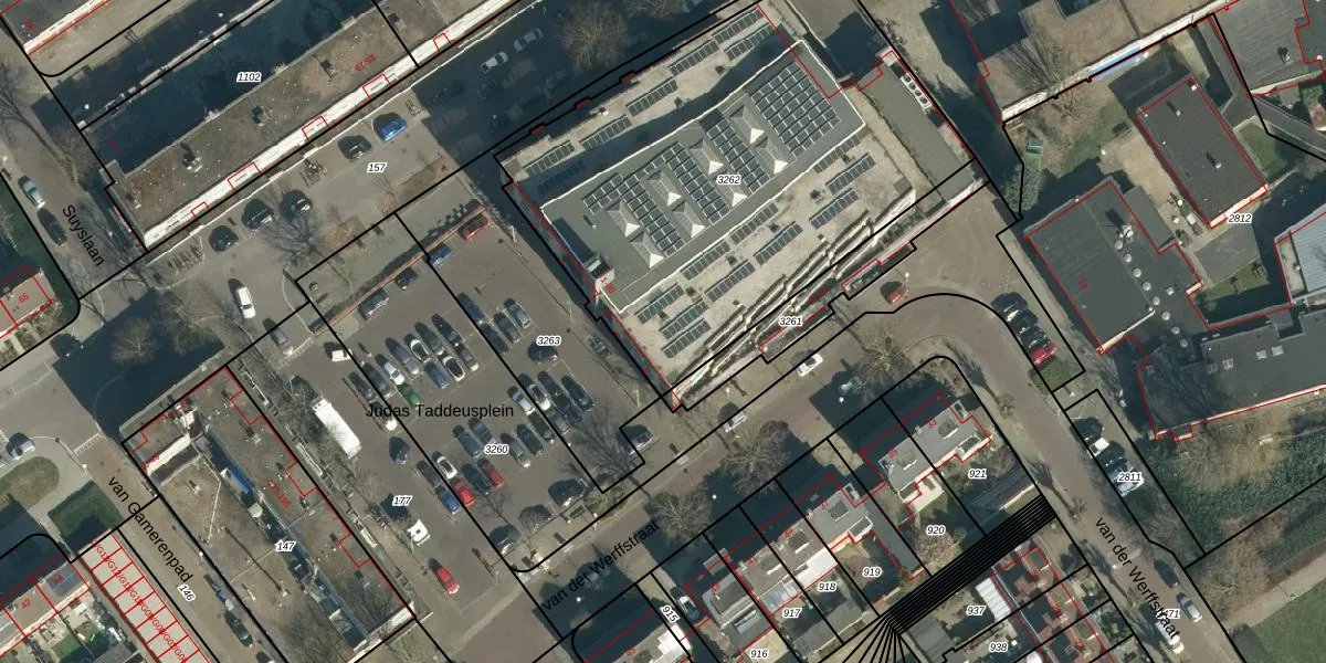 Judas Taddeusplein 14 is gelegen op kadastraal perceel WSL01P3262. Deze kadastrale aanduiding is uniek en wordt gebruikt door het Kadaster om eigendomsrechten en andere zakelijke rechten vast te leggen. Het perceel maakt onderdeel uit van de kadastrale gemeente Woensel.