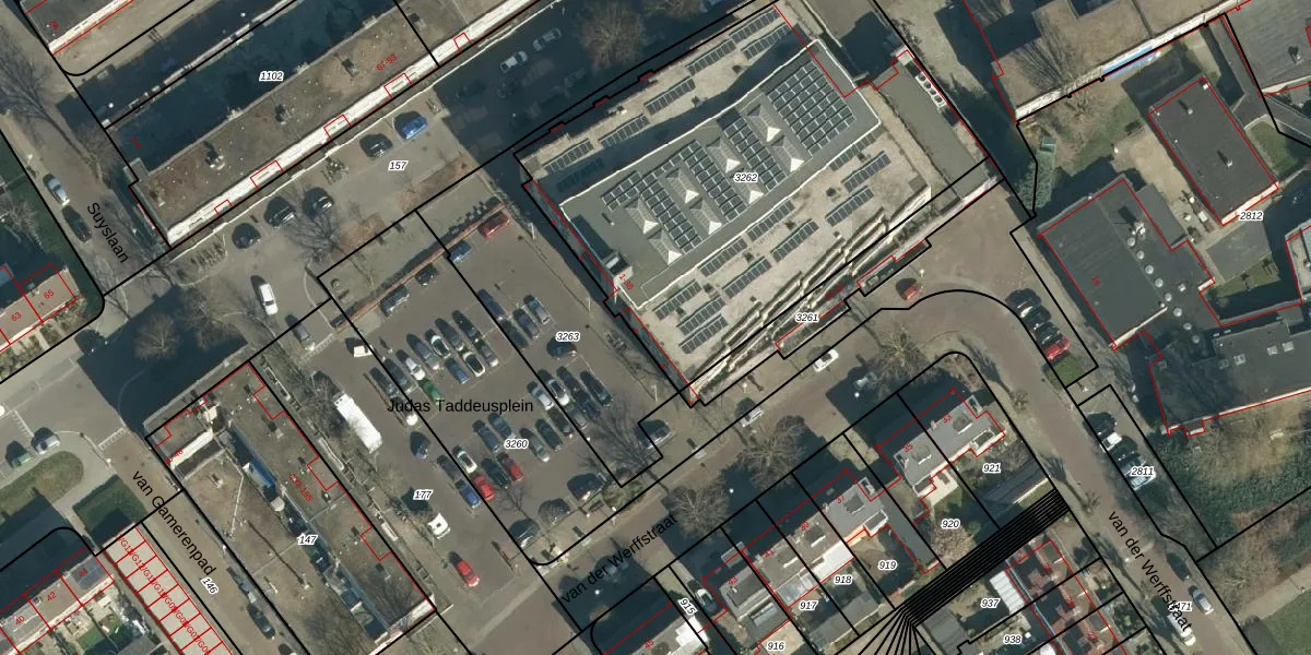 Judas Taddeusplein 2 is gelegen op kadastraal perceel WSL01P3262. Deze kadastrale aanduiding is uniek en wordt gebruikt door het Kadaster om eigendomsrechten en andere zakelijke rechten vast te leggen. Het perceel maakt onderdeel uit van de kadastrale gemeente Woensel.
