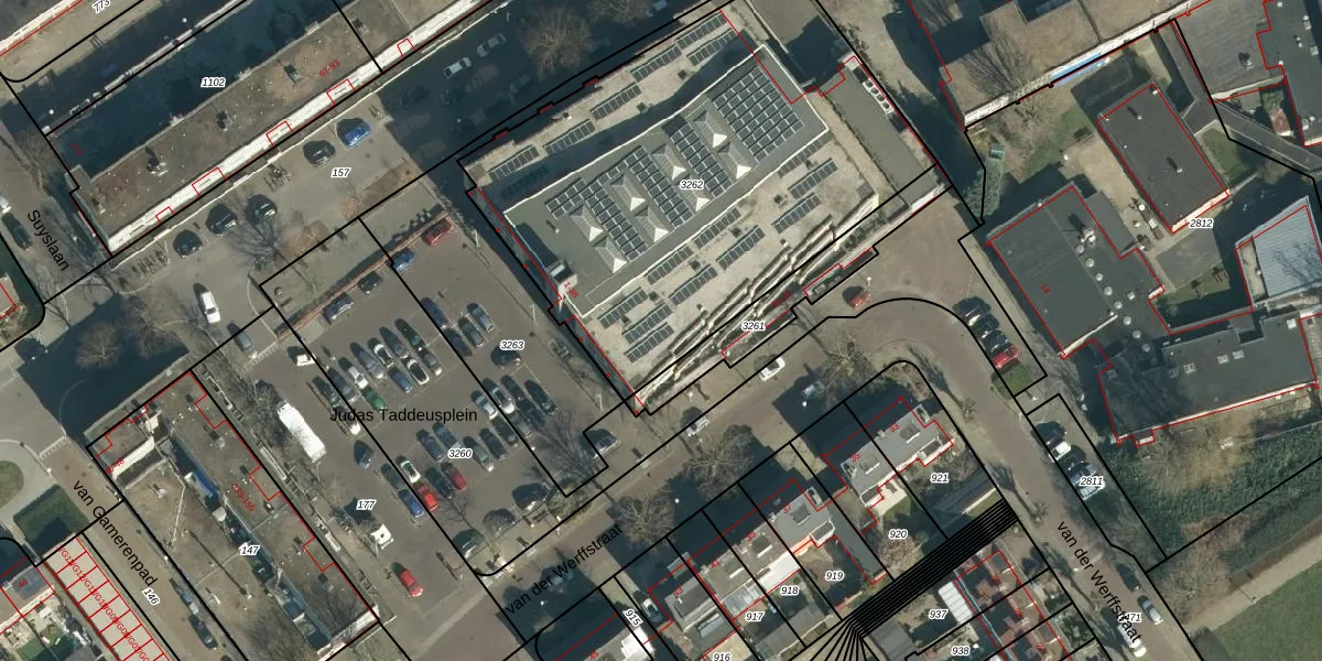 Judas Taddeusplein 25 is gelegen op kadastraal perceel WSL01P3262. Deze kadastrale aanduiding is uniek en wordt gebruikt door het Kadaster om eigendomsrechten en andere zakelijke rechten vast te leggen. Het perceel maakt onderdeel uit van de kadastrale gemeente Woensel.