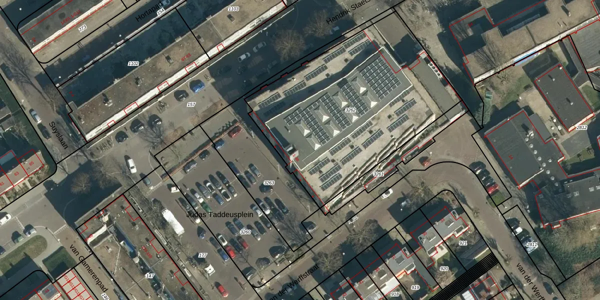 Judas Taddeusplein 8 is gelegen op kadastraal perceel WSL01P3262. Deze kadastrale aanduiding is uniek en wordt gebruikt door het Kadaster om eigendomsrechten en andere zakelijke rechten vast te leggen. Het perceel maakt onderdeel uit van de kadastrale gemeente Woensel.