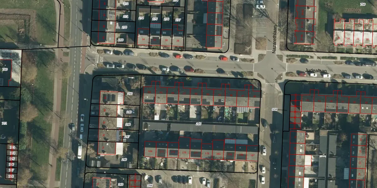 Het perceel waarop Judealaan 57 staat heeft een oppervlakte van 3189 m². Dit is een zeer groot perceel. De perceeloppervlakte wordt geregistreerd door het Kadaster. Gedetailleerde informatie over de maten van dit perceel kunt u vinden in het rapport Kadastrale kaart met maatvoering van Judealaan 57.