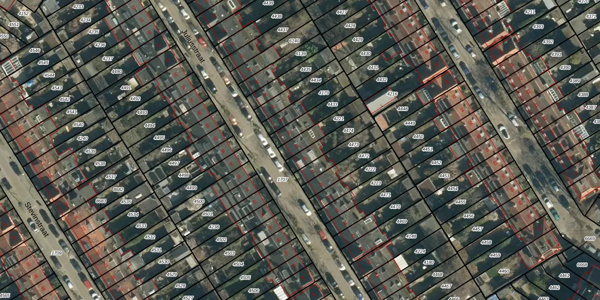 Het perceel waarop Juliusstraat 43 staat heeft een oppervlakte van 163 m². Dit is een middelgroot perceel. De perceeloppervlakte wordt geregistreerd door het Kadaster. Gedetailleerde informatie over de maten van dit perceel kunt u vinden in het rapport Kadastrale kaart met maatvoering van Juliusstraat 43.