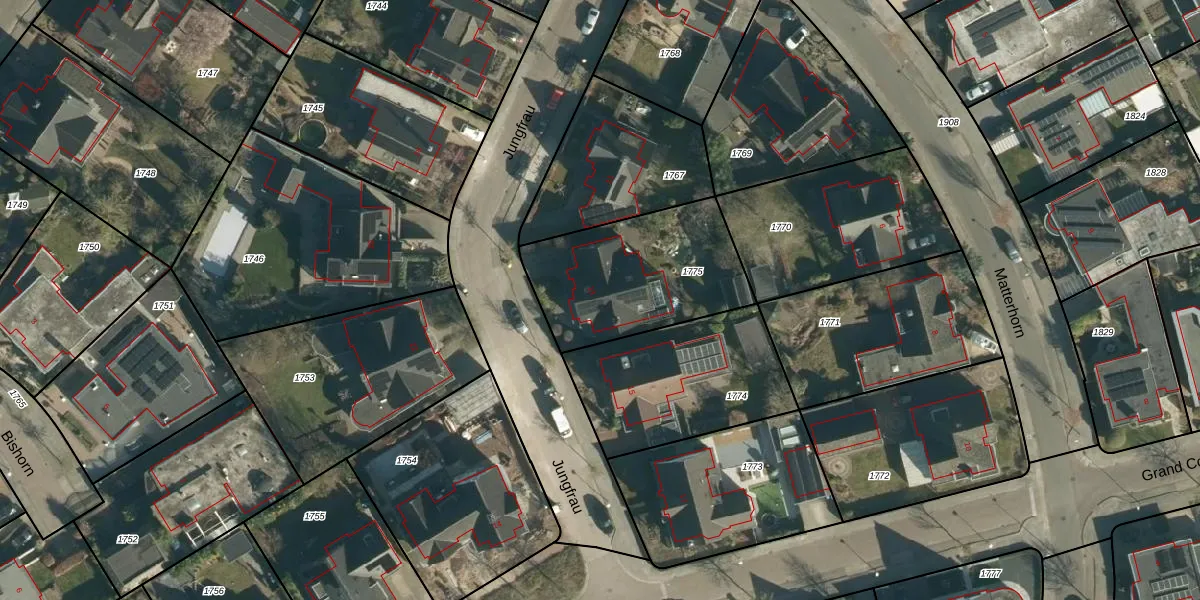 Het perceel waarop Jungfrau 13 staat heeft een oppervlakte van 647 m². Dit is een groot perceel. De perceeloppervlakte wordt geregistreerd door het Kadaster. Gedetailleerde informatie over de maten van dit perceel kunt u vinden in het rapport Kadastrale kaart met maatvoering van Jungfrau 13.