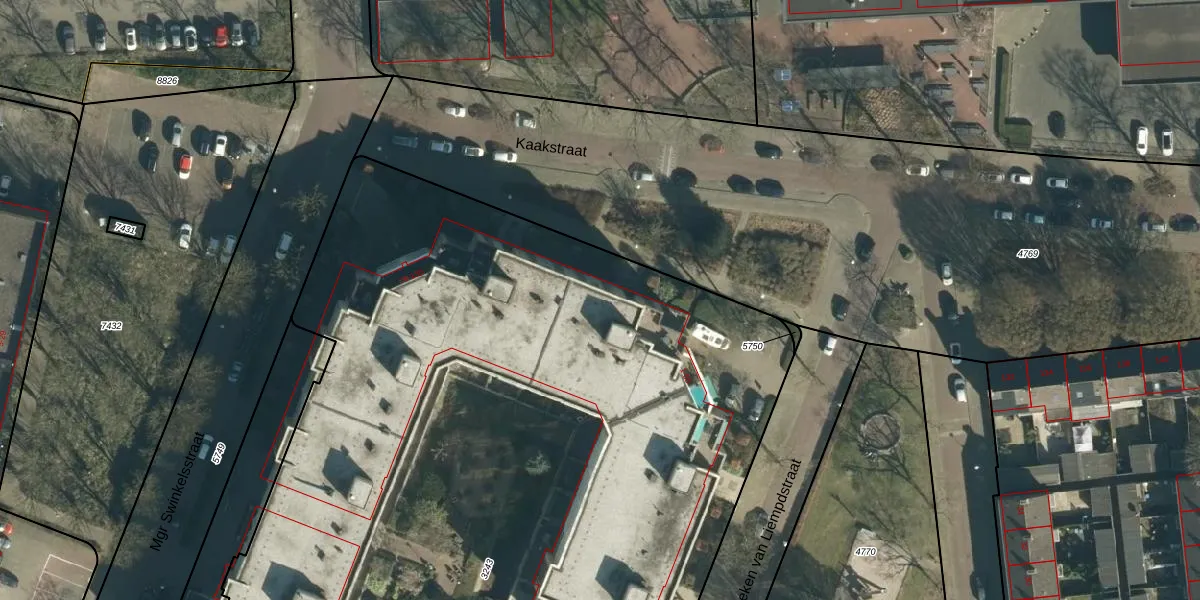 Kaakstraat 106 is gelegen op kadastraal perceel WSL01G3243. Deze kadastrale aanduiding is uniek en wordt gebruikt door het Kadaster om eigendomsrechten en andere zakelijke rechten vast te leggen. Het perceel maakt onderdeel uit van de kadastrale gemeente Woensel.