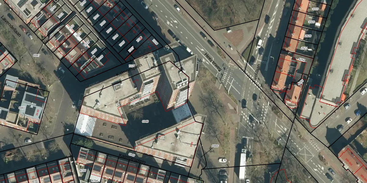 Het perceel waarop Kalmoesplein 13 staat heeft een oppervlakte van 2519 m². Dit is een zeer groot perceel. De perceeloppervlakte wordt geregistreerd door het Kadaster. Gedetailleerde informatie over de maten van dit perceel kunt u vinden in het rapport Kadastrale kaart met maatvoering van Kalmoesplein 13.