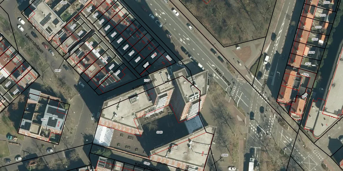 Het perceel waarop Kalmoesplein 26 staat heeft een oppervlakte van 2519 m². Dit is een zeer groot perceel. De perceeloppervlakte wordt geregistreerd door het Kadaster. Gedetailleerde informatie over de maten van dit perceel kunt u vinden in het rapport Kadastrale kaart met maatvoering van Kalmoesplein 26.