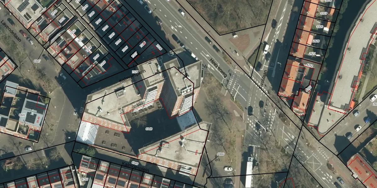 Het perceel waarop Kalmoesplein 42 staat heeft een oppervlakte van 2519 m². Dit is een zeer groot perceel. De perceeloppervlakte wordt geregistreerd door het Kadaster. Gedetailleerde informatie over de maten van dit perceel kunt u vinden in het rapport Kadastrale kaart met maatvoering van Kalmoesplein 42.