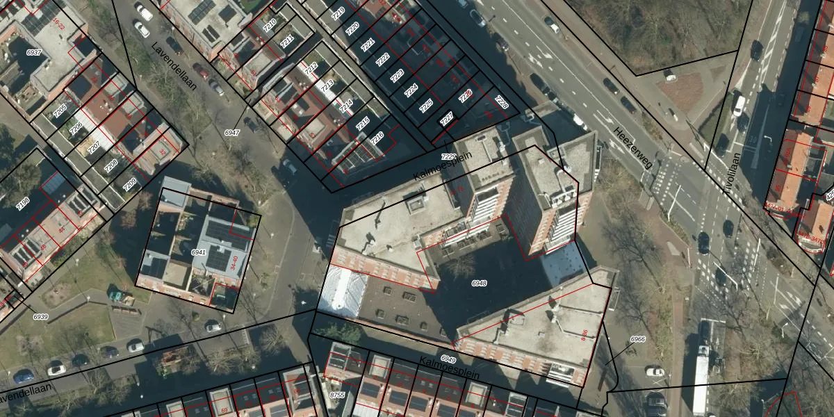Het perceel waarop Kalmoesplein 69 staat heeft een oppervlakte van 2519 m². Dit is een zeer groot perceel. De perceeloppervlakte wordt geregistreerd door het Kadaster. Gedetailleerde informatie over de maten van dit perceel kunt u vinden in het rapport Kadastrale kaart met maatvoering van Kalmoesplein 69.