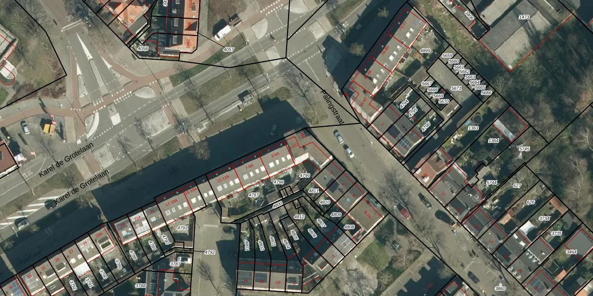 Karel de Grotelaan 1 is gelegen op kadastraal perceel GTL01D4797. Deze kadastrale aanduiding is uniek en wordt gebruikt door het Kadaster om eigendomsrechten en andere zakelijke rechten vast te leggen. Het perceel maakt onderdeel uit van de kadastrale gemeente Gestel.