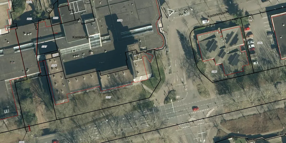 Het perceel waarop Kastelenplein 107 staat heeft een oppervlakte van 2137 m². Dit is een zeer groot perceel. De perceeloppervlakte wordt geregistreerd door het Kadaster. Gedetailleerde informatie over de maten van dit perceel kunt u vinden in het rapport Kadastrale kaart met maatvoering van Kastelenplein 107.