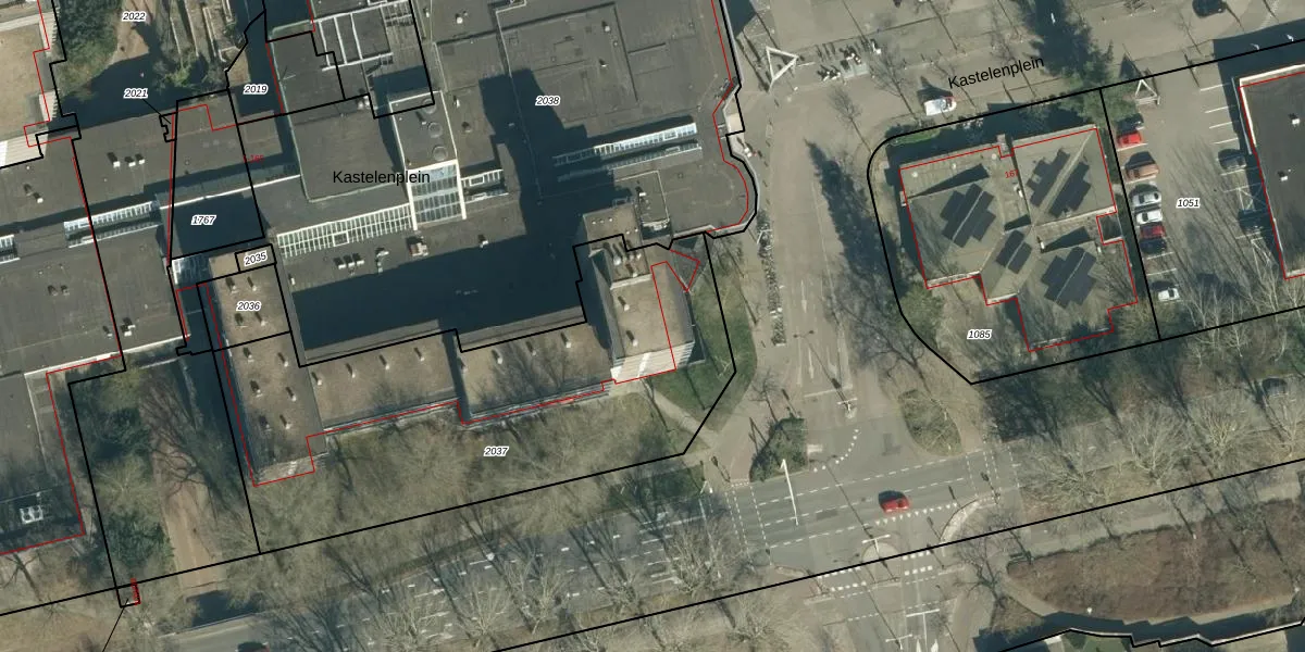 Het perceel waarop Kastelenplein 108 staat heeft een oppervlakte van 2137 m². Dit is een zeer groot perceel. De perceeloppervlakte wordt geregistreerd door het Kadaster. Gedetailleerde informatie over de maten van dit perceel kunt u vinden in het rapport Kadastrale kaart met maatvoering van Kastelenplein 108.