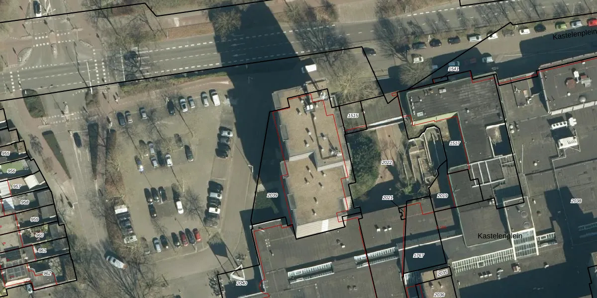 Het perceel waarop Kastelenplein 19 staat heeft een oppervlakte van 1253 m². Dit is een zeer groot perceel. De perceeloppervlakte wordt geregistreerd door het Kadaster. Gedetailleerde informatie over de maten van dit perceel kunt u vinden in het rapport Kadastrale kaart met maatvoering van Kastelenplein 19.