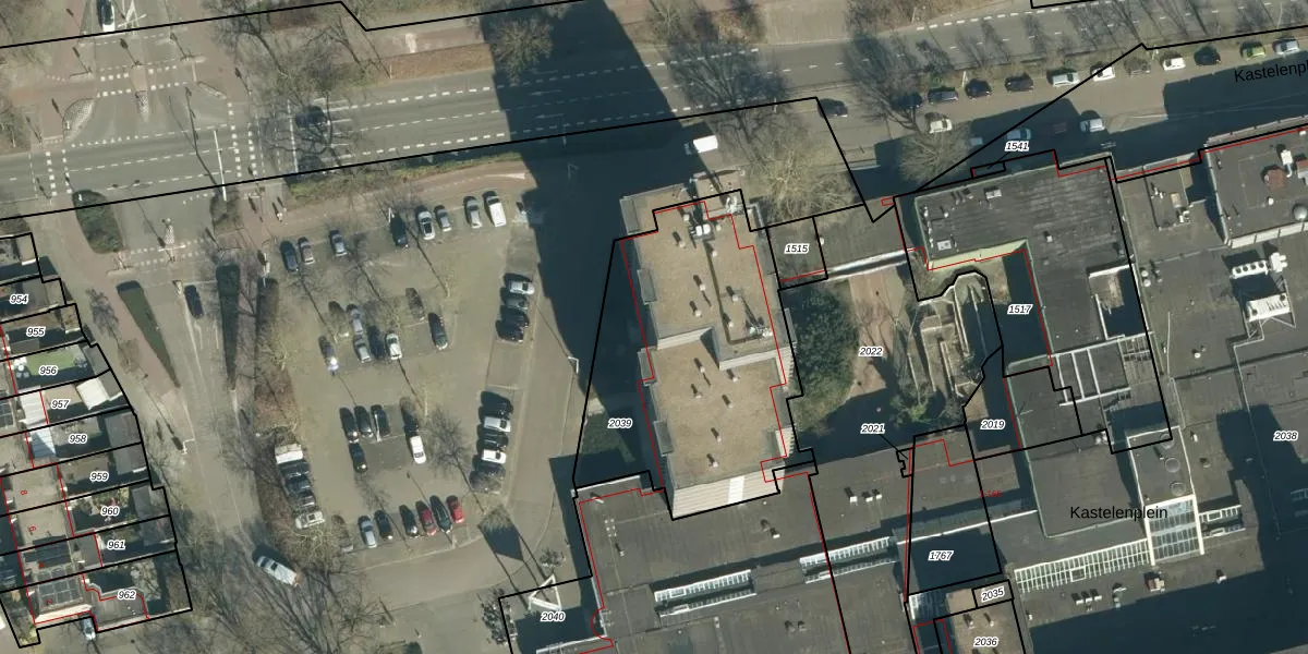 Het perceel waarop Kastelenplein 5 staat heeft een oppervlakte van 1253 m². Dit is een zeer groot perceel. De perceeloppervlakte wordt geregistreerd door het Kadaster. Gedetailleerde informatie over de maten van dit perceel kunt u vinden in het rapport Kadastrale kaart met maatvoering van Kastelenplein 5.