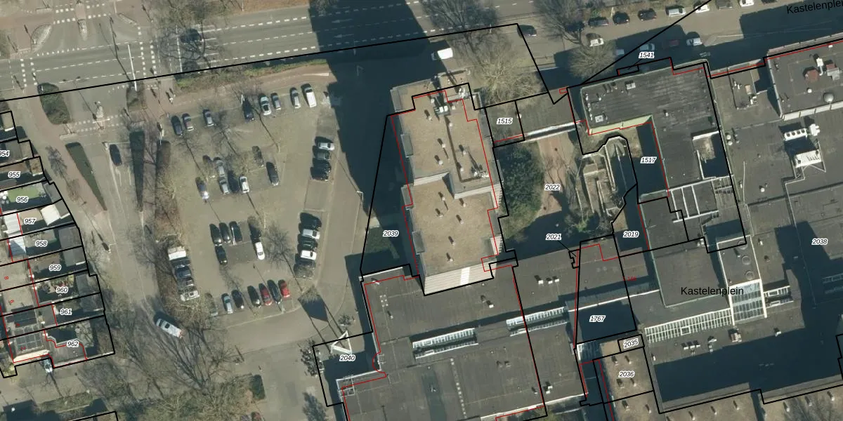 Het perceel waarop Kastelenplein 7 staat heeft een oppervlakte van 1253 m². Dit is een zeer groot perceel. De perceeloppervlakte wordt geregistreerd door het Kadaster. Gedetailleerde informatie over de maten van dit perceel kunt u vinden in het rapport Kadastrale kaart met maatvoering van Kastelenplein 7.