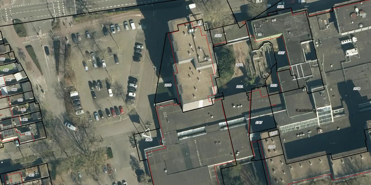 Het perceel waarop Kastelenplein 9 staat heeft een oppervlakte van 1253 m². Dit is een zeer groot perceel. De perceeloppervlakte wordt geregistreerd door het Kadaster. Gedetailleerde informatie over de maten van dit perceel kunt u vinden in het rapport Kadastrale kaart met maatvoering van Kastelenplein 9.
