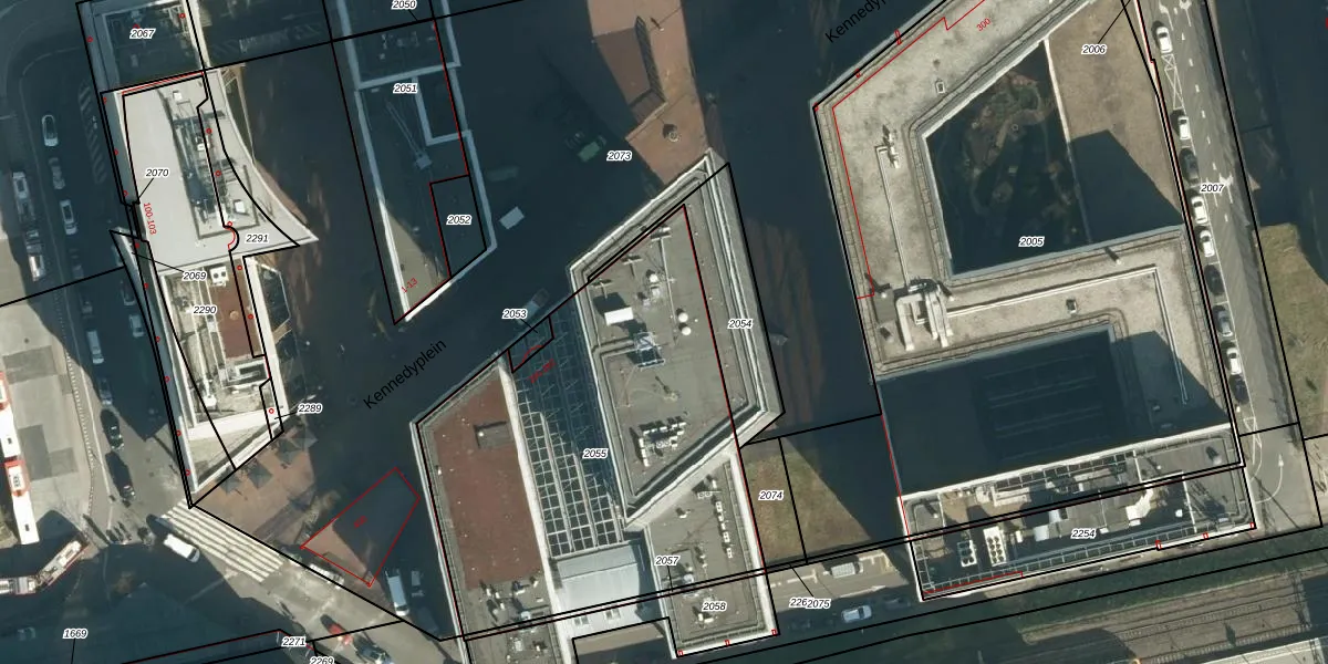 Het perceel waarop Kennedyplein 220 staat heeft een oppervlakte van 2042 m². Dit is een zeer groot perceel. De perceeloppervlakte wordt geregistreerd door het Kadaster. Gedetailleerde informatie over de maten van dit perceel kunt u vinden in het rapport Kadastrale kaart met maatvoering van Kennedyplein 220.