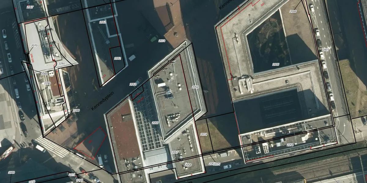 Het perceel waarop Kennedyplein 226 staat heeft een oppervlakte van 2042 m². Dit is een zeer groot perceel. De perceeloppervlakte wordt geregistreerd door het Kadaster. Gedetailleerde informatie over de maten van dit perceel kunt u vinden in het rapport Kadastrale kaart met maatvoering van Kennedyplein 226.