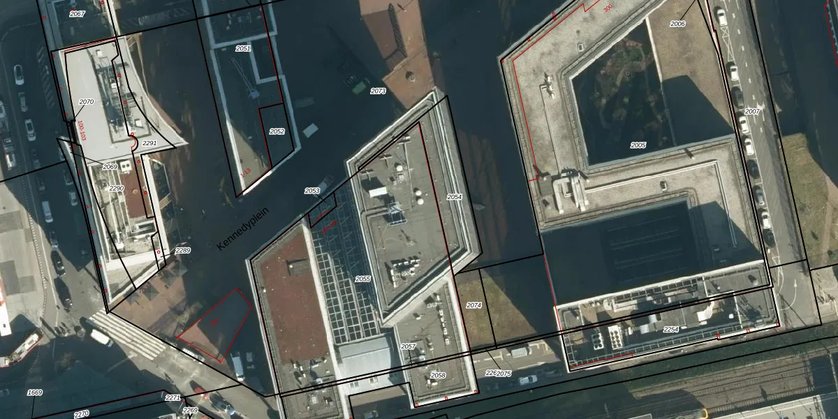 Het perceel waarop Kennedyplein 230 staat heeft een oppervlakte van 2042 m². Dit is een zeer groot perceel. De perceeloppervlakte wordt geregistreerd door het Kadaster. Gedetailleerde informatie over de maten van dit perceel kunt u vinden in het rapport Kadastrale kaart met maatvoering van Kennedyplein 230.